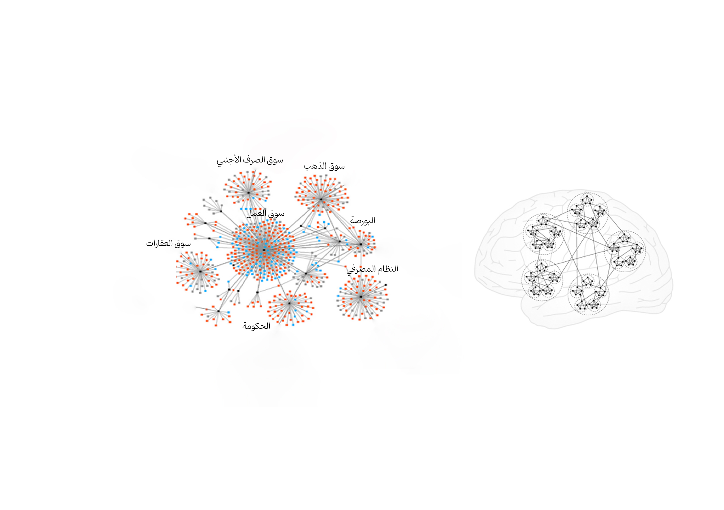 يوضح الشكل 2-ب تمثيلاً تخطيطياً للنظام الاقتصادي المعقد. في هذه الدراسة، تمت محاكاة سوق العمل كنظام معقد بشكل مبسط للغاية. تم اعتماد الافتراضات التالية في عملية المحاكاة:
