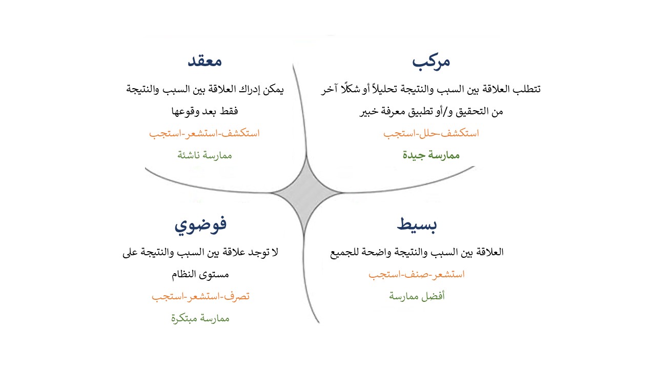 في إطار التصنيف المفاهيمي المعروف بإطار “ساينفن” (Cynefin Framework)، يتم تصنيف النظم إلى خمسة أنواع: بسيطة، ومعقدة التشابك، ومعقدة، وفوضوية، ومنطقة الاضطراب أو الحيرة (المنطقة المركزية)، كما هو موضح في الشكل 1 (Kurtz & Snowden, 2003).