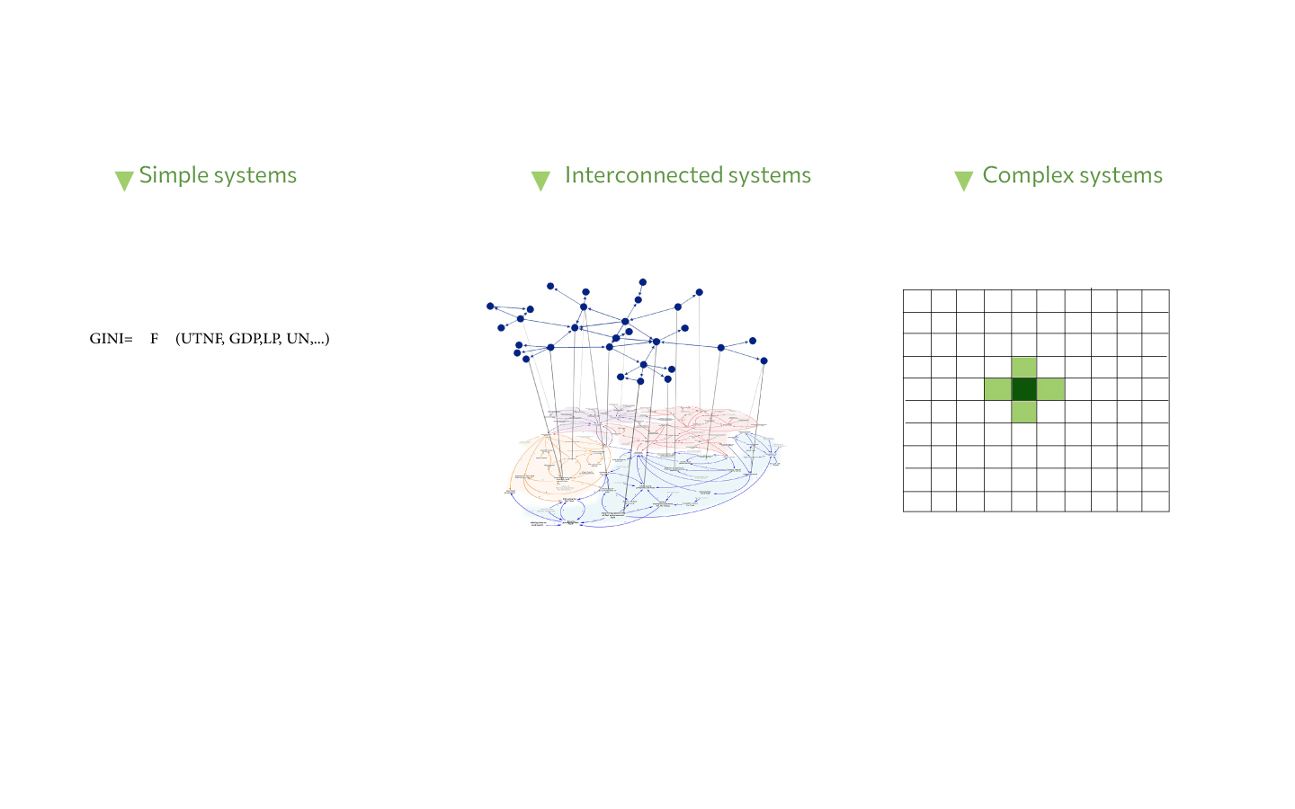 وبنفس الطريقة، فإن الأداة المناسبة لنمذجة القطاعات الاقتصادية المختلفة على المستوى الكلي، باعتبارها نظامًا متشابكًا، هي الأدوات الخوارزمية مثل الشبكات السببية أو شبكات التدفق. ومع ذلك، في بعض الأحيان، وفي تبسيط غير واقعي إلى حد ما، يتم اعتبار الاقتصاد كنظام بسيط واستخدام أدوات مثل الدوال الرياضية في مثل هذه النمذجة (الشكل 5).