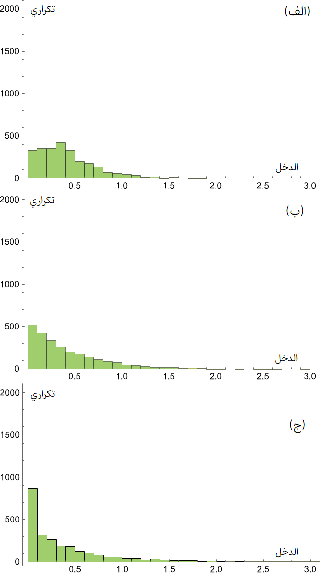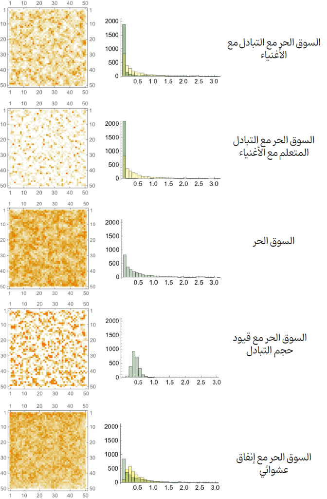 النموذج الأول (السوق الحرة): يوضح الشكل 6 تغيرات توزيع الدخل بين العوامل الاقتصادية بدءاً من التوزيع الأولي المنطقي (أ) حتى الوصول إلى حالة التوازن النهائي (ج). تُظهر النتائج أنه في ظل افتراض السوق الحرة، تزداد أعداد الفقراء بشكل كبير بينما تقل أعداد الأغنياء بشكل أسي، وهو ما يتوافق مع توزيع بولتزمان في الميكانيكا الإحصائية.