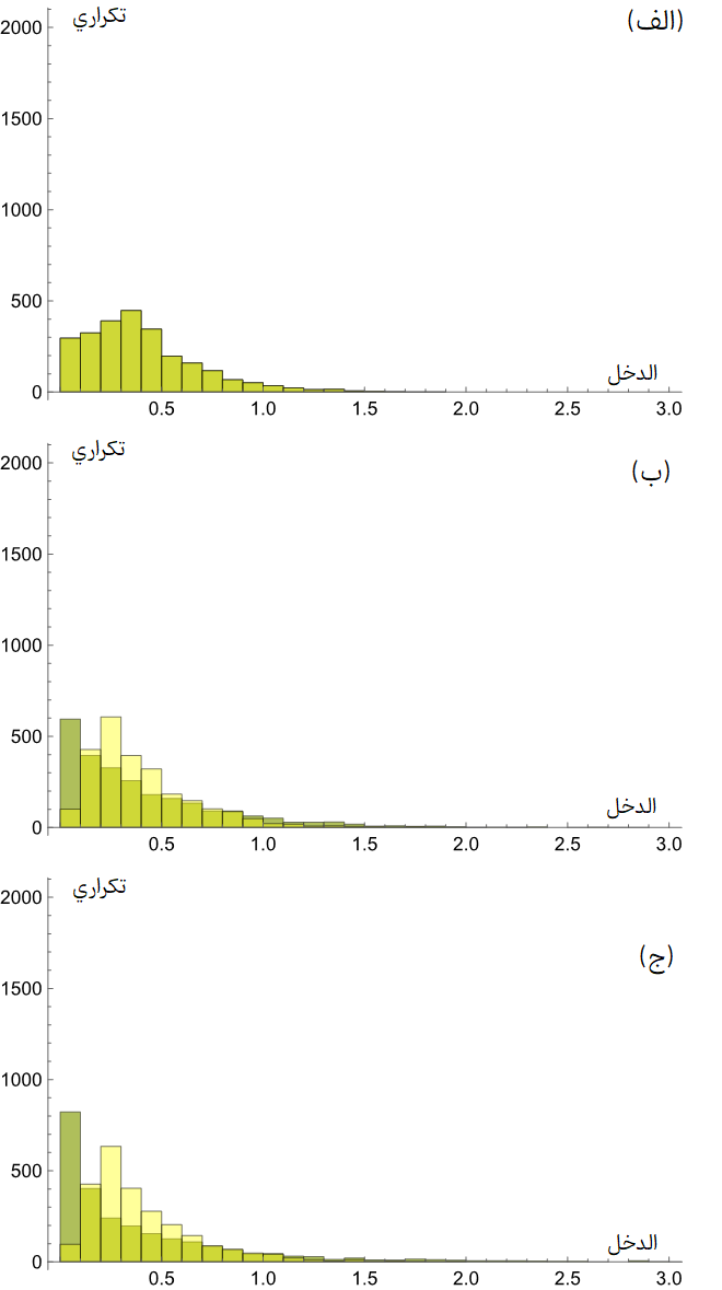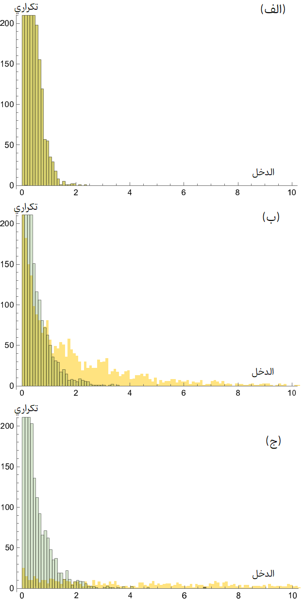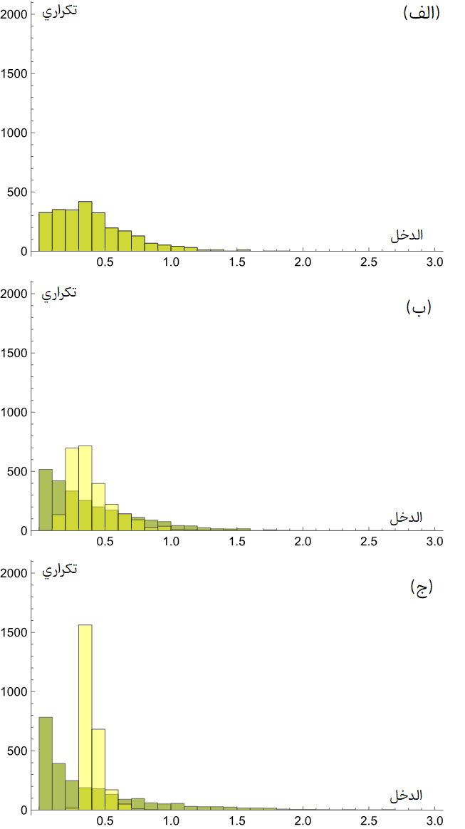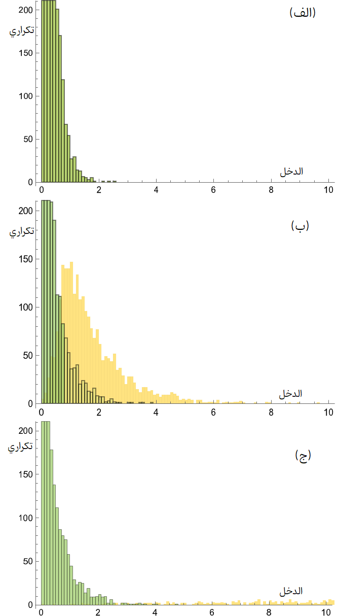الشكل ٧. مقارنة تغيرات توزيع الدخل بافتراض التبادل في الاقتصاد الحر (باللون الأخضر) والاقتصاد الإنفاقي (باللون الأصفر): (أ) أولي، (ب) بعد تبادل واحد، (ج) بعد الوصول إلى التوازن