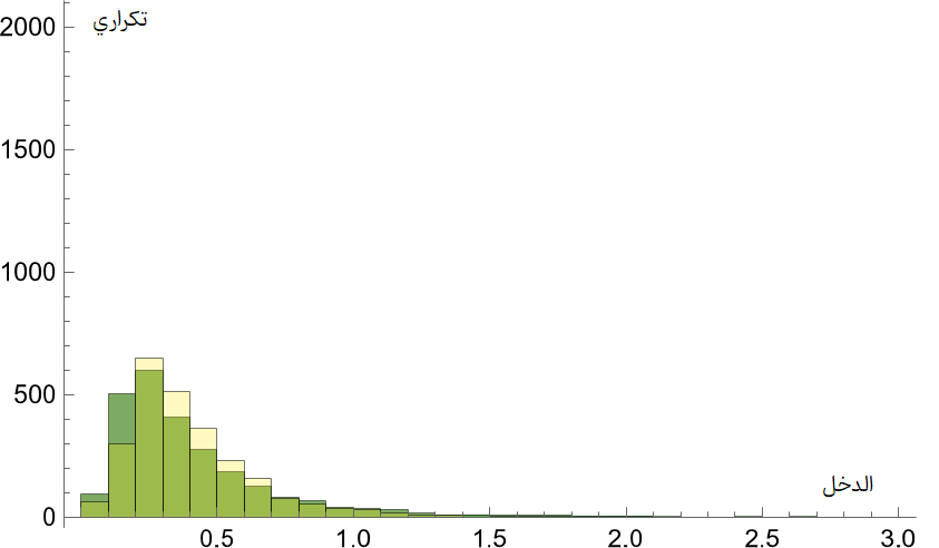 الشكل ٩. مقارنة مخططات توزيع الدخل (المتوازنة) للاقتصاد العشوائي الحر-الإنفاق الكامل (أخضر) والاقتصاد الحر-الإنفاق المحدود (أصفر)