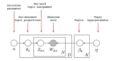 من خلال هذه العملية (الشكل ١)، يستنتج LDA البنية الموضوعية الكامنة بتحليل توزيع الكلمات عبر النص. تشمل مخرجات LDA: