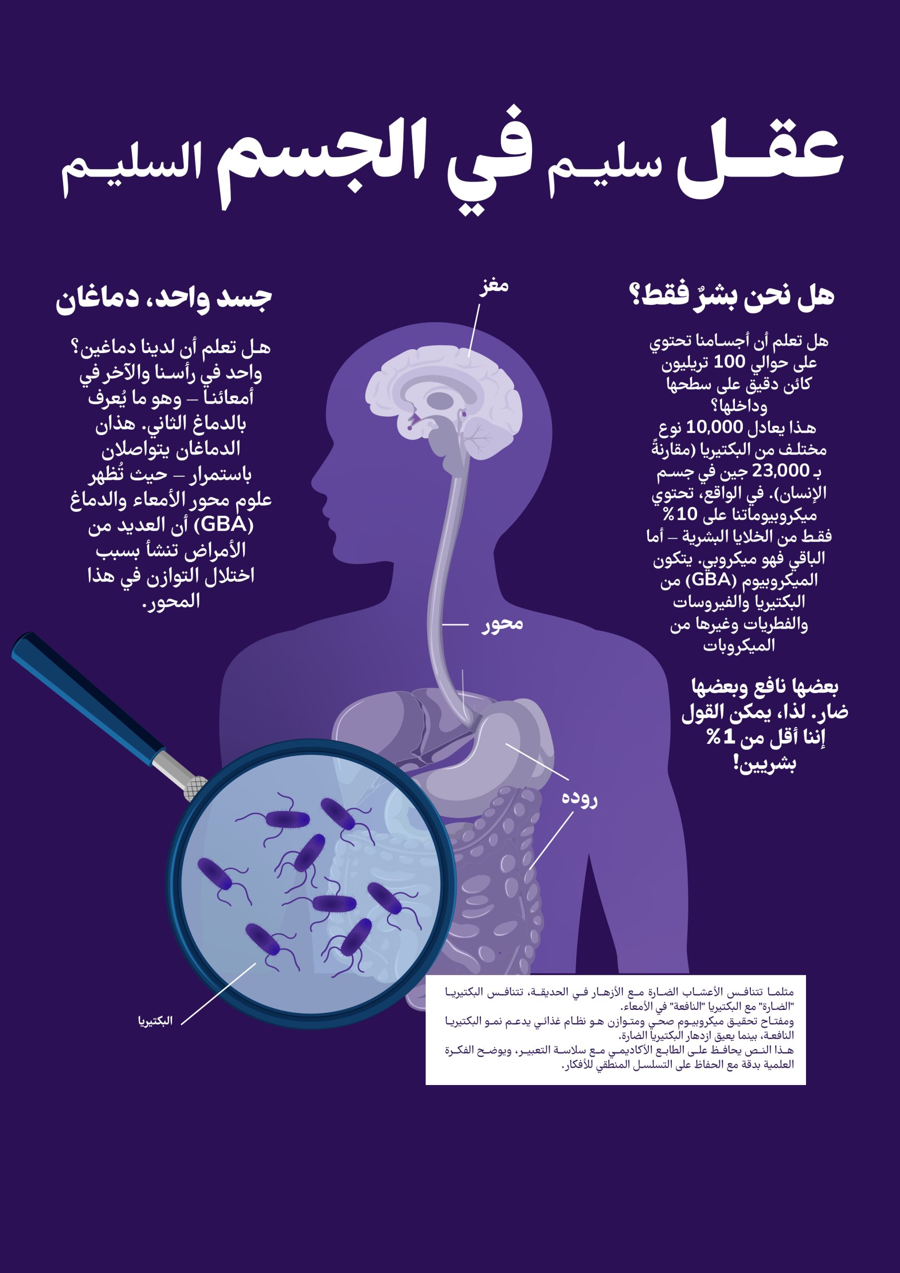 بينما تطورنا مع هذه الميكروبيوتا، فإنها تلعب دورًا محوريًا في توجيه وظائف أجهزة الجسم الأخرى. المثير للاهتمام هو أن جينومنا البشري ثابت وموروث، في حين أن الميكروبيوتا متنوعة وقابلة للتغير، مما يعني أنها تمتلك “جينومًا ديناميكيًا” يستجيب للعوامل البيئية ويمكن أن يكون هدفًا للتدخلات العلاجية. وهذا يطرح السؤال: إلى أي درجة يمكن للميكروبيوتا أن تتحكم فينا (جسديًا ونفسيًا وسلوكيًا)؟