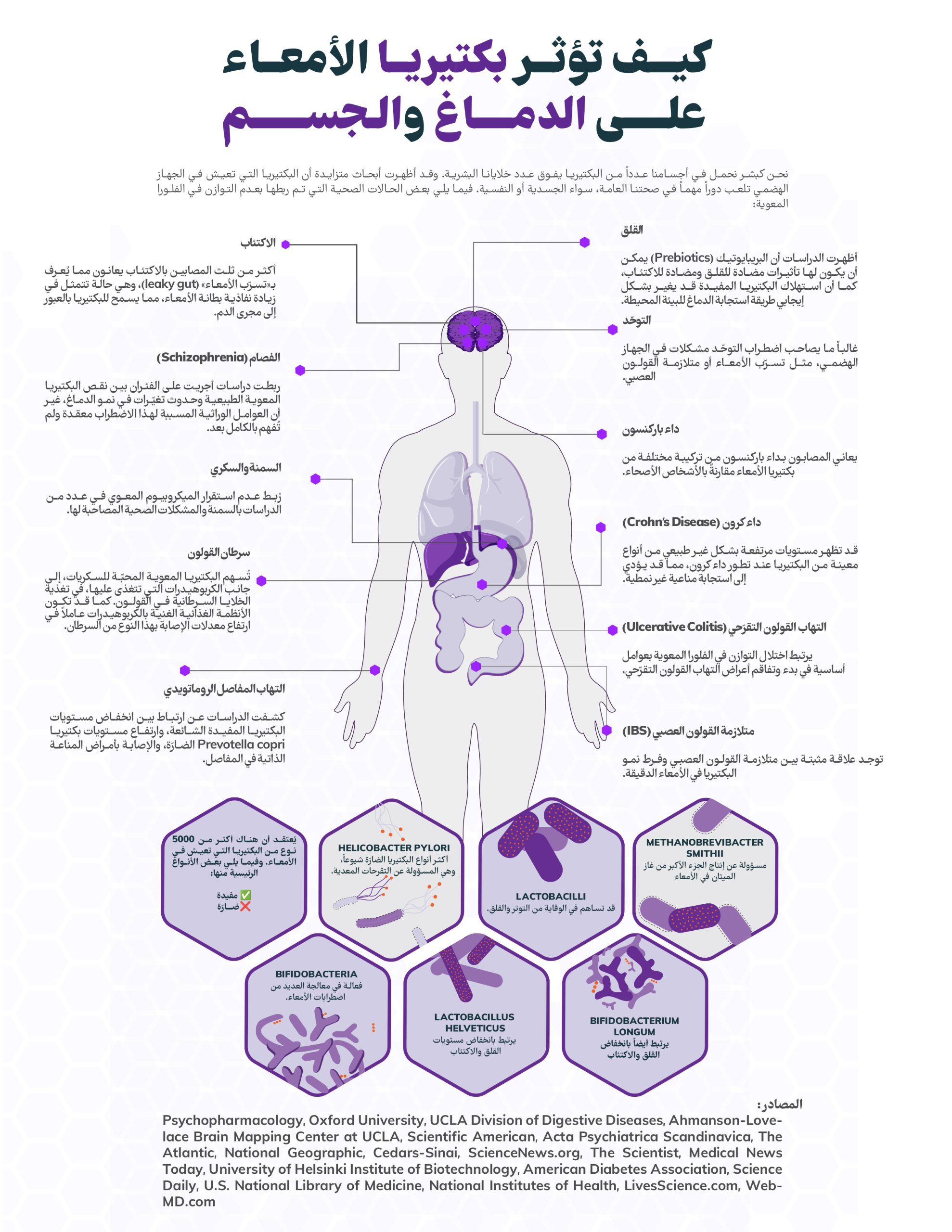 أمراض الدماغ والاضطرابات النفسية [٤٤]، بما في ذلك مفهوم “النفسانيّات الحيوية(Psychobiotics)” كبديل للعقاقير النفسية [٤٥].