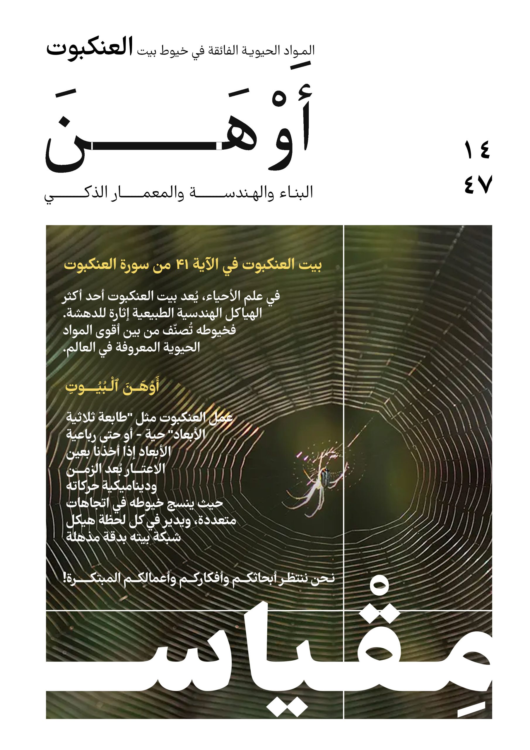 بيت العنكبوت، رغم كونه مصنوعاً من أحد أقوى المواد الحيوية، وصف في القرآن الكريم بأنه “أوهن البيوت”. هذا التناقض الظاهري يدفعنا لدراسة خصائص خيوط العنكبوت العلمية، وهندسة بيته، والرسالة العلمية والمعرفية العميقة لهذا الكائن المدهش. ندعو الطلاب والباحثين من مختلف التخصصات (علم الأحياء، الهندسة، علوم المواد، والتقنيات الحديثة) لدراسة هذا التركيب المعقد من زوايا متعددة.