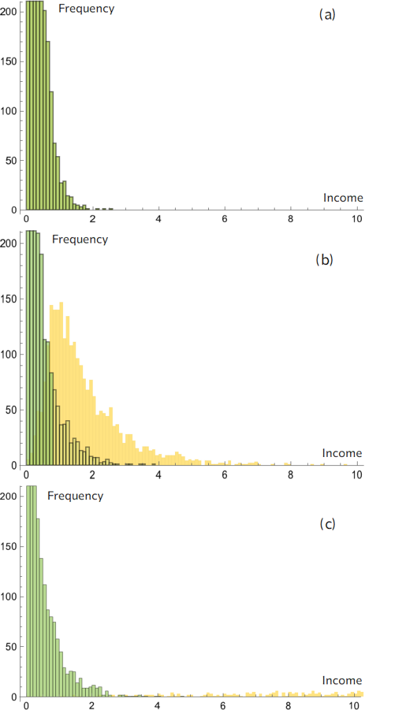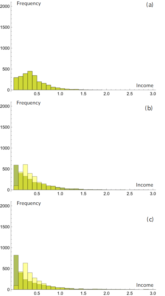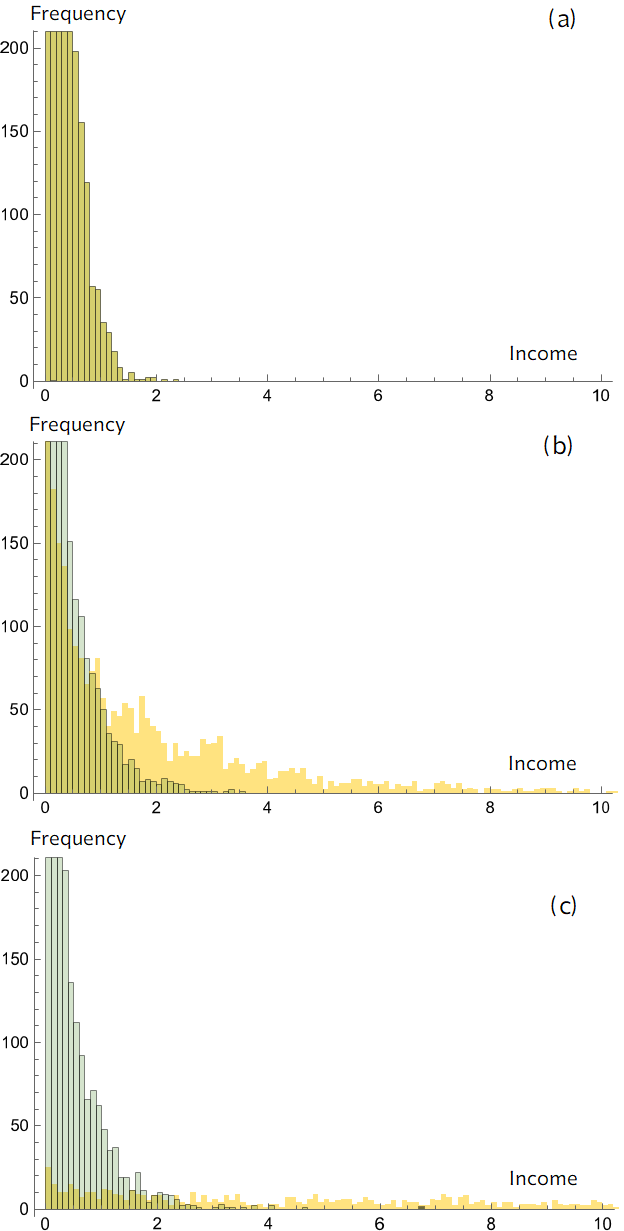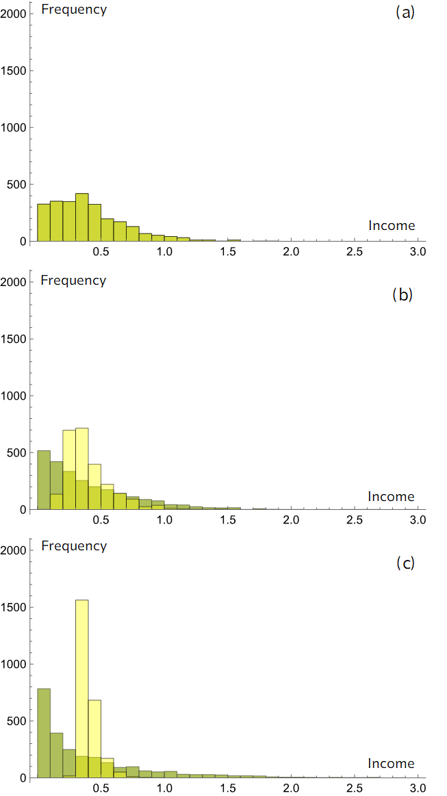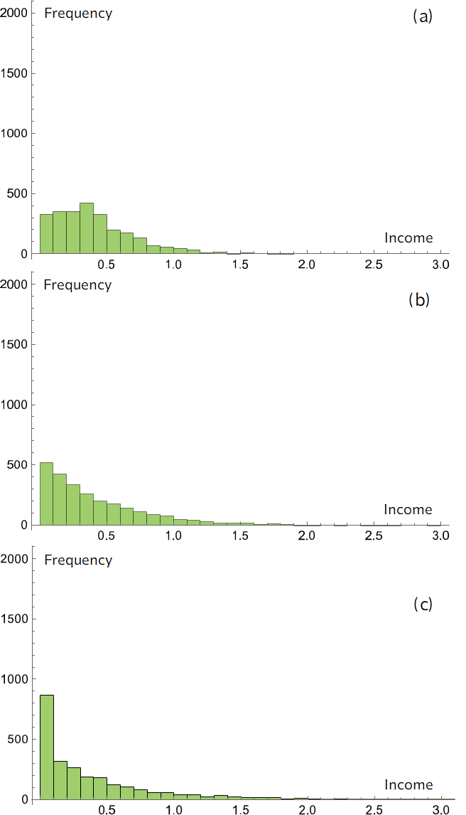 Figure 6. Income distribution changes under free market exchange assumptions: (a) initial, (b) after one exchange, and (c) after reaching equilibrium