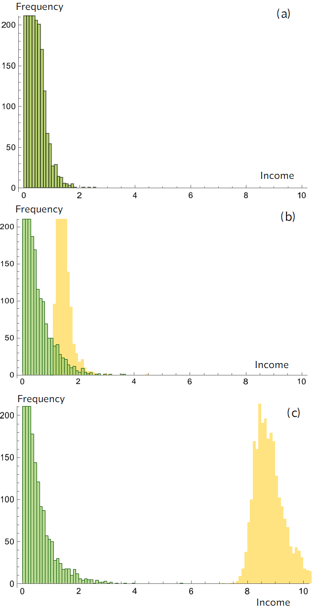 Figure 8. Comparison of income distribution changes under free market (green) and randomized free-full charity economy (yellow) assumptions: (a) initial, (b) after one exchange, and (c) after reaching equilibrium