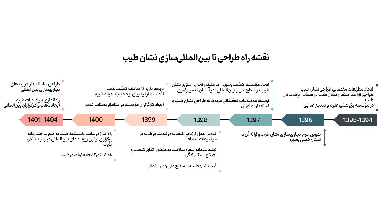 نقشه راه بین المللی سازی نشان طیب از سال 1394 تا 1404 بر اساس یک طرح مطالعاتی به سفارش مؤسسه کیفیت رضوی و توسط دانشکده کارآفرینی دانشگاه تهران تدوین شد که در شکل زیر نشان داده شده است؛